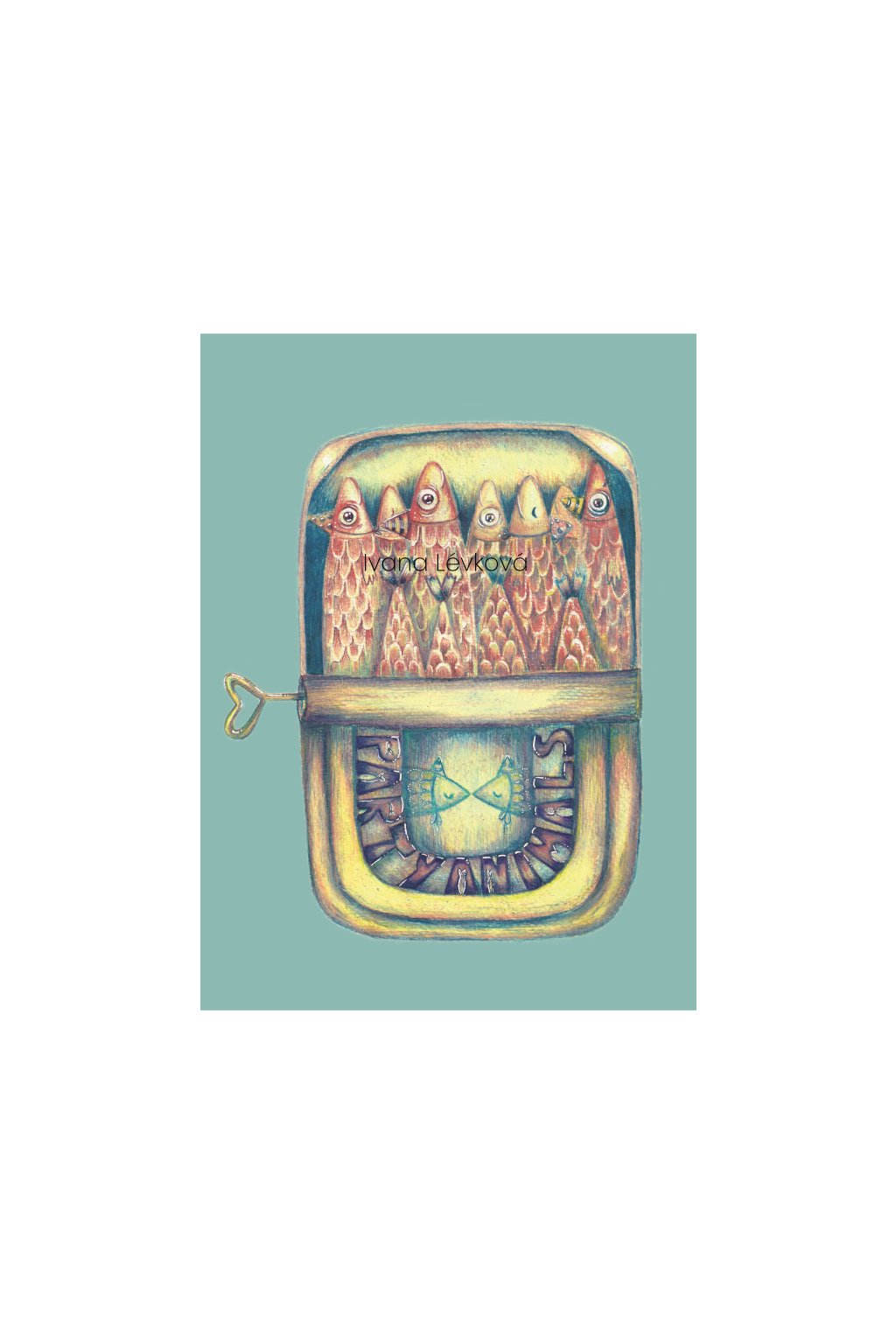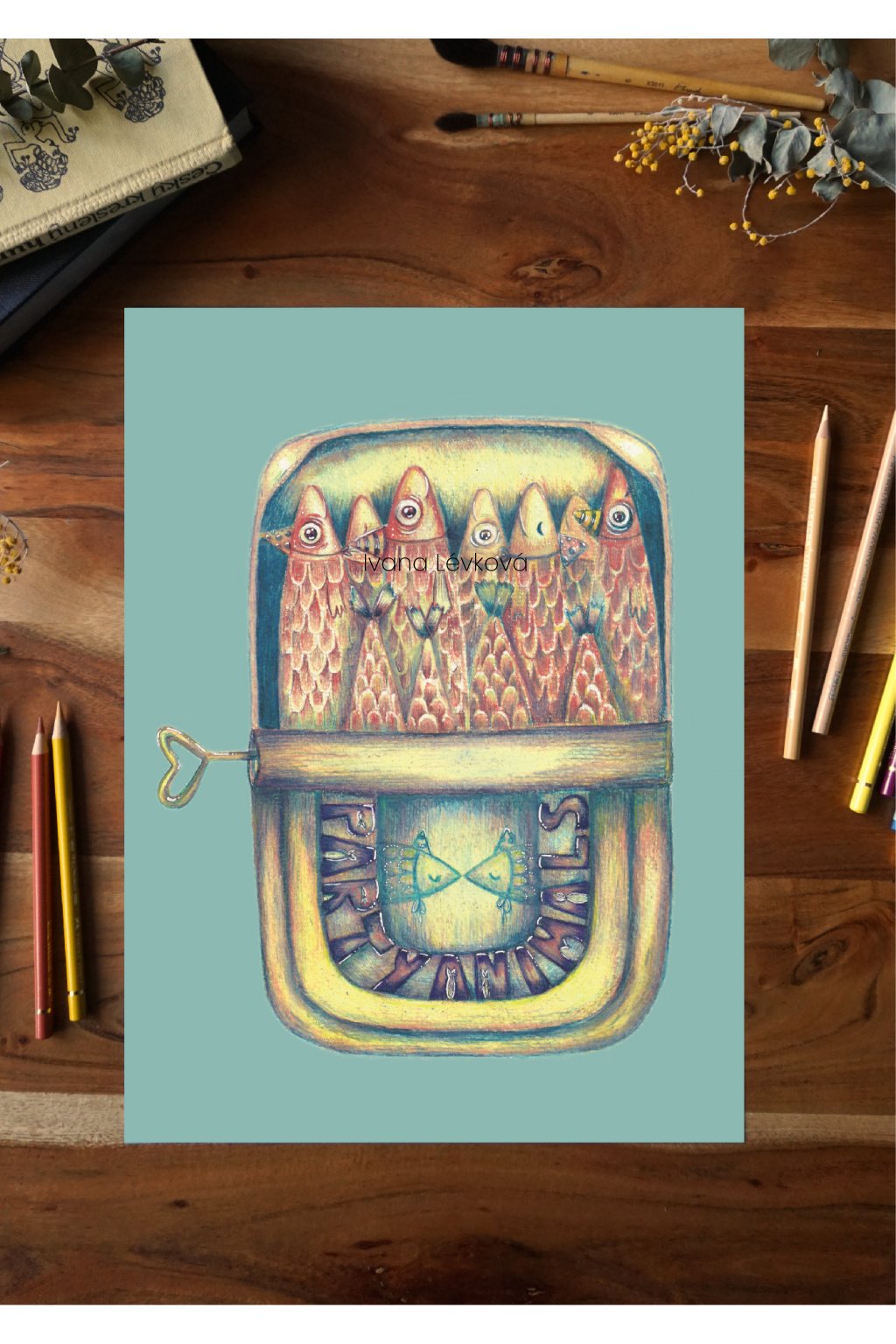 - Umělecký tisk Party Animals z původní kresby pastelkami na papíře.
